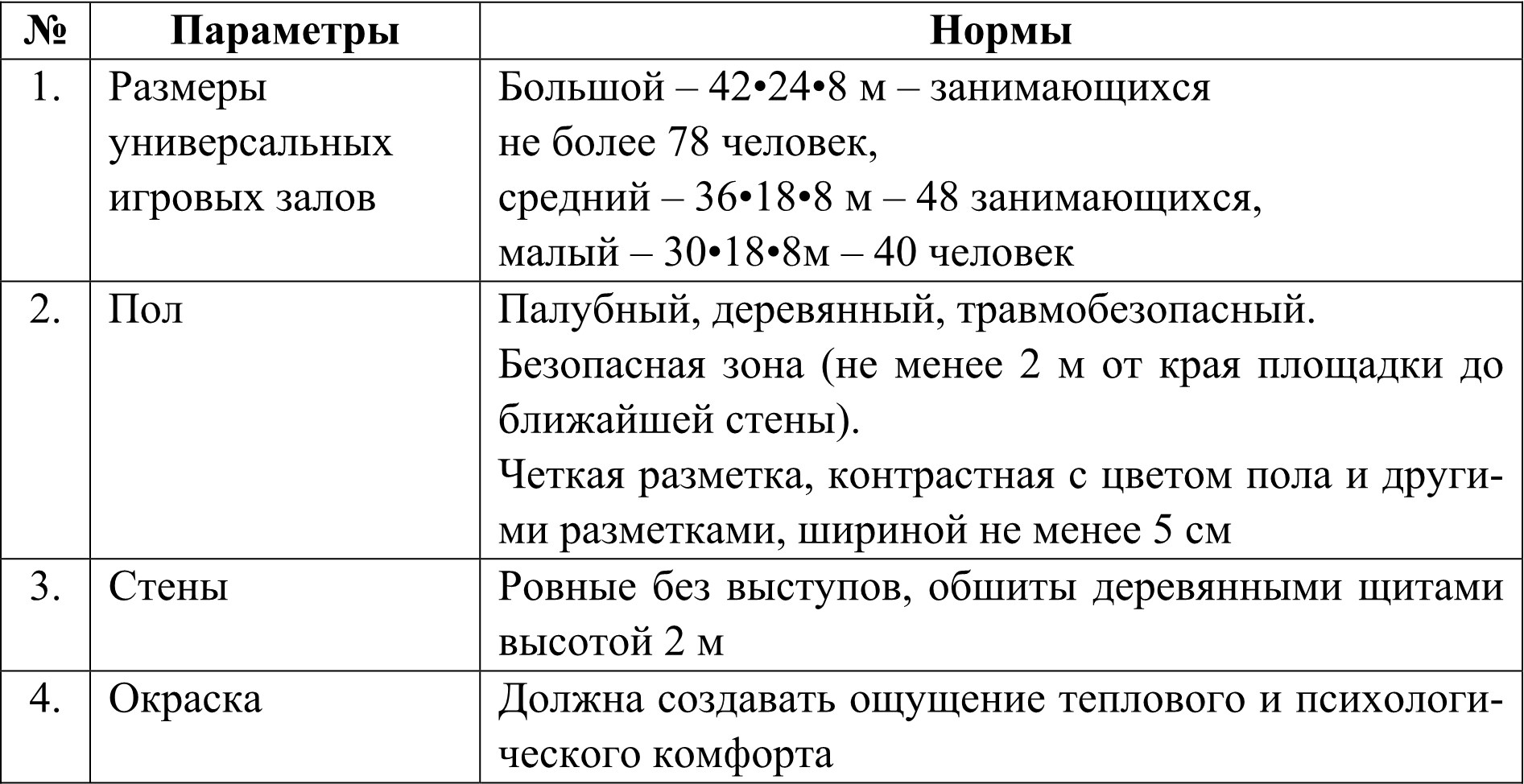 Помимо требований к построению физкультурно-спортивных сооружений необходимо учитывать гигиенические нормы содержания спортивных залов [4]. Эта информация есть и в учебных пособиях А.П. Лаптева, С.А. Полиевского, А.М. Симоненко [2].