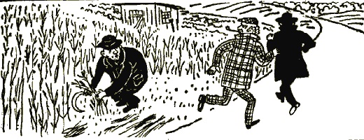 — Большое спасибо! — крикнул инспектор Варнике, пробегая мимо. Но вдруг он остановился, молниеносно выхватил из кармана пистолет и бросился к продолжавшему жать лен человеку. — Черт побери, чуть было не упустил этого субчика! Руки вверх! На этот раз, уважаемый, тебе не удастся ускользнуть!