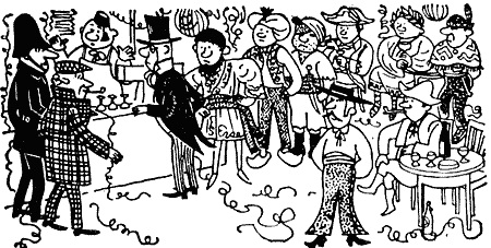 — Прошу сохранять спокойствие, — сказал сержант Миллер, обращаясь к небольшой компании, устроившей в ресторане костюмированный вечер. — Мы разыскиваем опасного преступника, и следы привели нас именно сюда. Он должен быть среди вас.