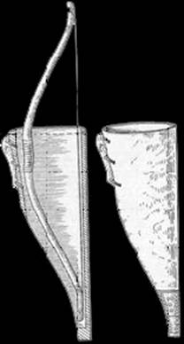 содержимого - содержимое было и так достаточно крепко, чтобы выдержать порядочный удар. Налучье предназначалось исключительно для удобства транспортировки.Как и тул, налучье оснащалось костяными накладками - петлями для привешивания и декоративными украшениями - теми же накладками, металлическим клепаным орнаментом или красивой тканью с узором (в случае берестяных и деревянных изделий).