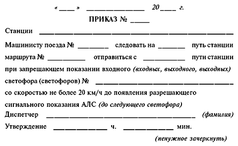 1.14. При запрещающем показании (красный огонь, один красный и один жёлтый огни, погасшие огни, непонятное показание) входного или выходного светофора полуавтоматического действия приём поезда на станцию или отправление поезда со станции после остановки перед светофором допускается по пригласительному сигналу, а при его неисправности — по приказу или копии приказа поездного диспетчера со скоростью не более 20 км/ч при нажатой педали (кнопке) бдительности до появления разрешающего сигнального показания АЛС, а поезда, не оборудованного устройствами АЛС-АРС или с неисправными устройствами АЛС-АРС, а также на линии, не оборудованной АЛС-АРС, со скоростью не более 20 км/ч до следующего светофора, за исключением предупредительного (форма приказа дана в п. 1.18, форма бланка копии приказа — в п. 1.41).