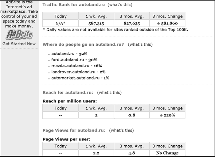 Статистика основывается на результатах обработки запросов пользователей, на компьютерах которых установлен тулбар Alexa. Это достаточно репрезентативная выборка, хотя и не вполне объективная для русскоязычного Интернета, поскольку относительно небольшой процент пользователей рунета вообще слышал о существовании Alexa, еще меньшее число людей установили себе этот тулбар. В частности, статистика показывает, какие страницы сайта наиболее часто посещаются (это отражено в разделе «Where do people go on autoland.ru?», внешний вид которого приведен на рис. 27).