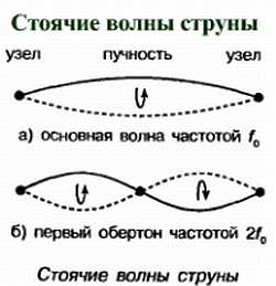 • Стоячие волны могут образоваться на колеблющейся струне с узлом на каждом конце. При таком колебании длина струны измеряется целым числом половин длины волны. Если длина колеблющейся струны равна одной половине длины волны, то такая волна называется основной.