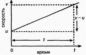 Если тело движется по прямой линии с постоянным ускорением а, значит, его скорость изменяется на постоянную величину за единицу времени. Если начальная скорость равна u, то скорость v через промежуток времени t вычисляется по формуле