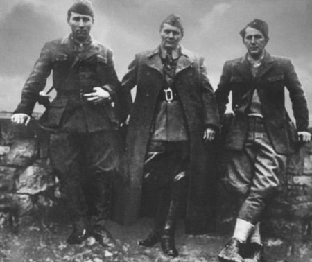 центре) с Александром Ранковичем (слева) и Милованом Джиласом. 1943 г.