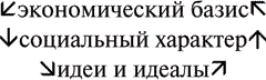 Концепция социального характера также служит для объяснения связи между материальным базисом общества и «идеологической надстройкой». Марксу часто приписывали утверждение о том, что идеологическая надстройка – всего лишь отражение экономического базиса. Такая интерпретация неверна; дело в том, что в теории Маркса природа связи между базисом и надстройкой не была достаточным образом объяснена. Динамическая психология может показать, что общество порождает социальный характер, а социальный характер имеет тенденцию вырабатывать идеологию, которая его удовлетворяет и им питается. Однако порождение экономическим базисом определенного социального характера, который, в свою очередь, порождает определенные идеи, не однонаправлено: идеи, однажды возникнув, также влияют на социальный характер и косвенно на социоэкономическую структуру. Я хочу подчеркнуть следующее: социальный характер – посредник между социоэкономической структурой и идеями и идеалами, распространенными в обществе. Это посредник, который действует в обоих направлениях: от экономического базиса к идеям и от идей к экономическому базису. Данное положение иллюстрирует следующая схема: