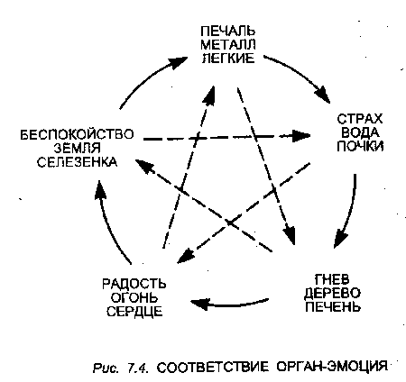 Если обобщим содержащуюся в таблицах информацию и сопоставим жизненные органы и основные эмоции, то получится диаграмма, изображенная на рис. 7.4.