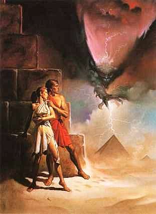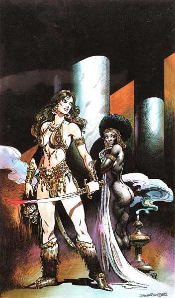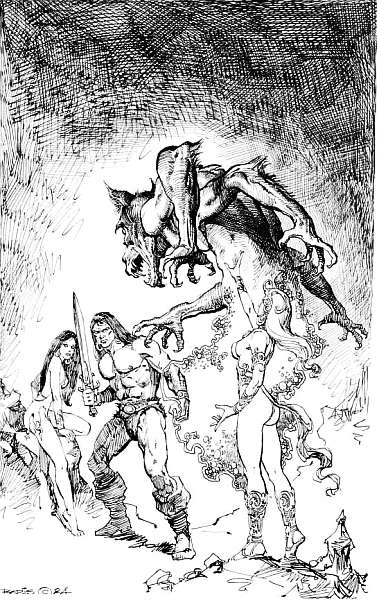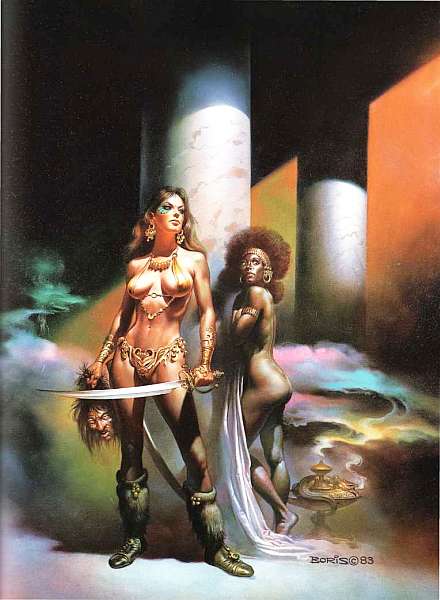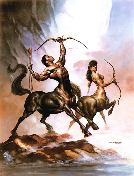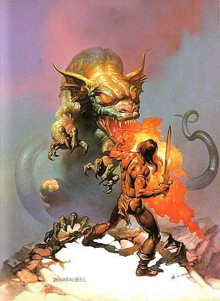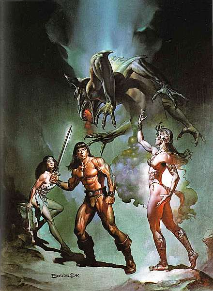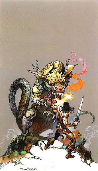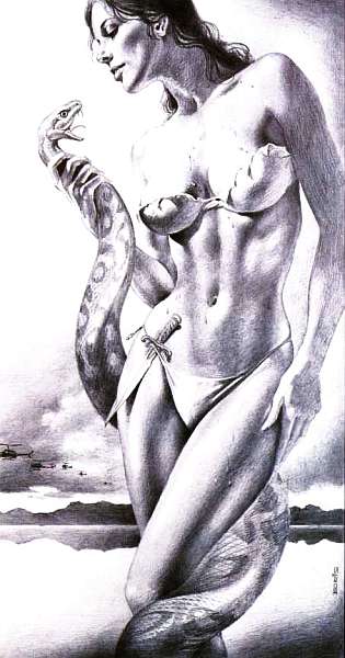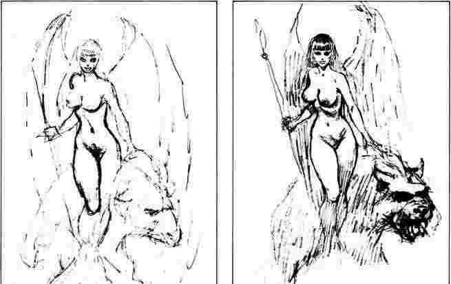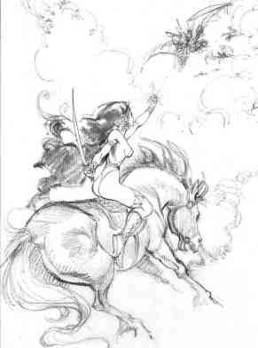 На картине, изображающей вооруженную всадницу с летящими на нее монстрами, — см. набросок для «War scull of Hel» (Боевая лодка богини смерти), с. 69 — конь представляет собой пример того, как я пожертвовал правдоподобием ради определенных эффектов. Я пошел на преувеличения и изменил анатомию, чтобы усилить драматизм и динамику картины. Понятно, что если бы конь изогнул шею, как на картине, то его морда подалась бы не вперед, а касалась бы груди. Однако я чувствовал, что, утрируя движение коня и заставляя его вытягивать морду вперед, я добился впечатления резкости его остановки и передал намерение всадницы пустить его вскачь. Это можно увидеть в пластике конной фигуры — сопротивление коня угадывается в напряжении передних ног и в том, как чересчур опущен зад. Хотя я и знаю анатомию лошади, я сознательно пошел на неточность, дабы решить художественные задачи.