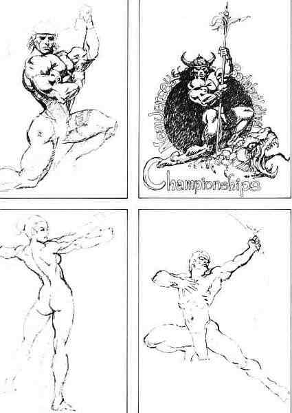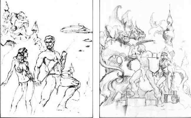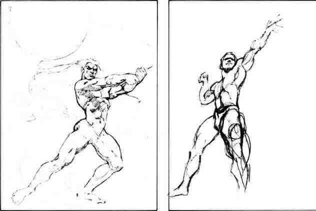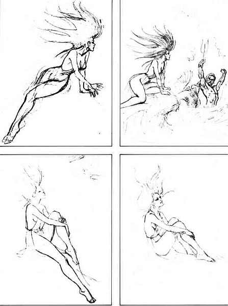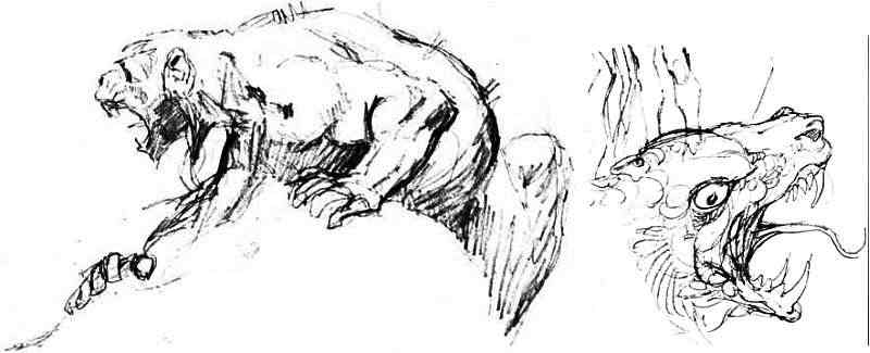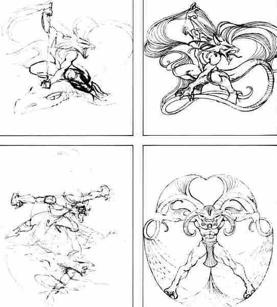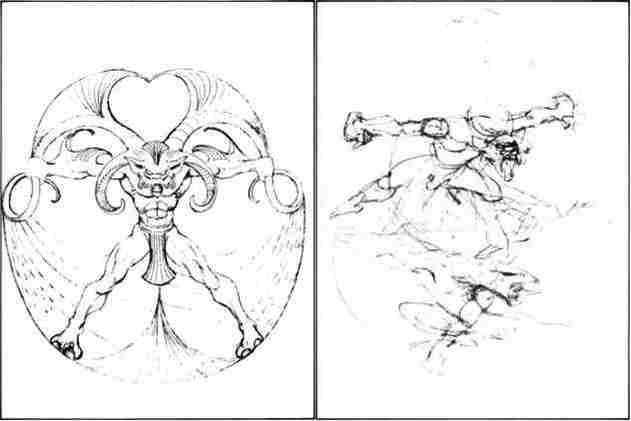 Например, рисуя карандашом монстра на кальке (для пряжки на поясе), я начал с формы буквы «S». Мне сразу представилась более или менее законченная вещь, но как ее зафиксировать на бумаге — это уже совсем другая история. Мозг каким-то образом видит вещи иначе, чем глаз. Похоже, что в моей голове эта штука как бы двигалась еще до того, как я попытался ее ухватить и уложить на место. Это все равно что делать набросок движущейся фигуры. Как правило, вы ухватываете не всю ее целиком, а лишь ее небольшую часть, лишь какое-то мгновение. Именно множество мгновений, складываясь воедино, и создают единое целое.
