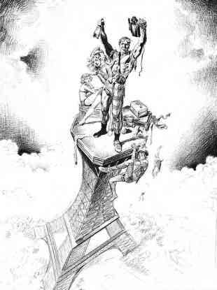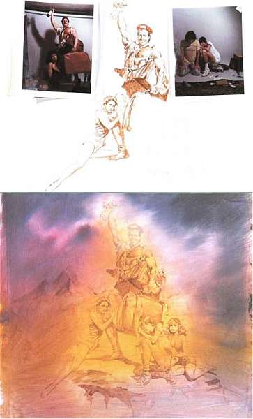 не прибегать к специальному скипидару для живописи и пользуюсь для подготовительного рисунка разбавителем, который и предназначен для работы в домашних условиях. Это имеет свои преимущества: краски высыхают быстрее, чем скипидар, и, в отличие от него, не пахнут, что более удобно для работы.По завершении подготовительного рисунка (то есть когда набросок переведен на картон и нанесена лессировка из основных цветов, которые я собираюсь использовать) я приступаю к окончательной работе. Я всегда начинаю с того, что находится на заднем плане. Фигуры следует согласовать с задним планом, чтобы придать им нужную меру выразительности. К тому же в процессе работы объекты на переднем плане должны перекрывать то, что на заднем. Это дает более четкие границы. Я предпочитаю использовать масляные краски фирмы Winsor amp; Newton. Что касается кистей, 75 процентов из них — тоже от Winsor & Newton.