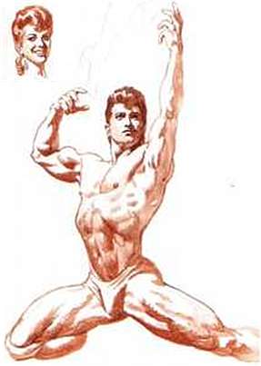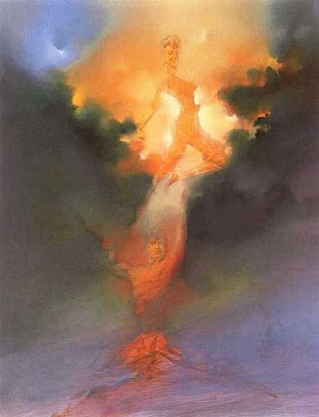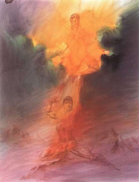 Далее я покрыл акриловой краской (жженой умброй) карандашный рисунок, изображающий мужчину, и голову женской фигуры. Здесь под нанесенной краской еще видны карандашные линии. Даже на этом предварительном этапе я весьма основательно проработал световые акценты, полутона, глубокие тени. Той же акриловой краской я наметил горы и скалу, на которой находится мужчина.