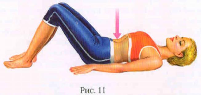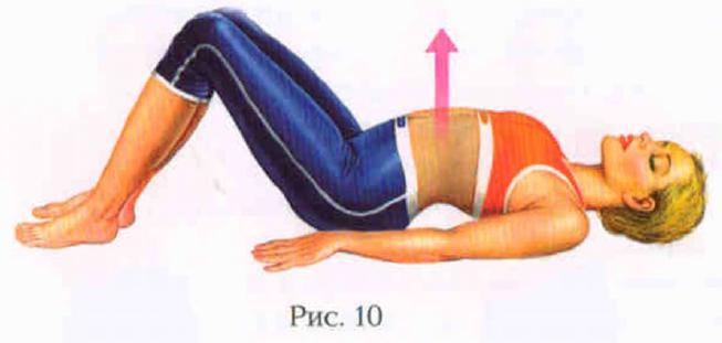 Лягте на спину, согните ноги в коленях, бедра поставьте параллельно друг другу, ступни уприте в пол. Сделайте глубокий вдох на счет 5 и выгните спину над полом. При этом мышцы спины должны сократиться, а мышцы живота расслабиться. Направьте нефритовое яичко вниз к входу. Сделайте выдох, напрягите интимные мышцы вместе с мышцами живота, прижав спину к полу, задержите дыхание на пять секунд. При этом