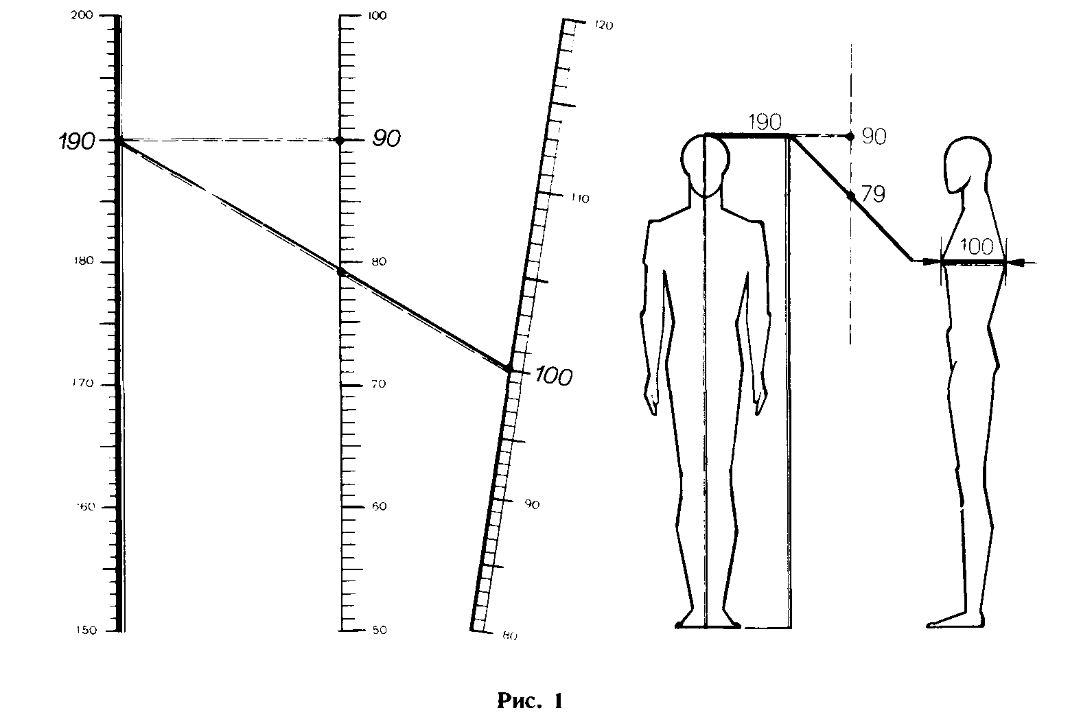 Например (см. рис. 1), при росте 190 см и окружности грудной клетки 100 см нормальная масса тела равна 79 кг.