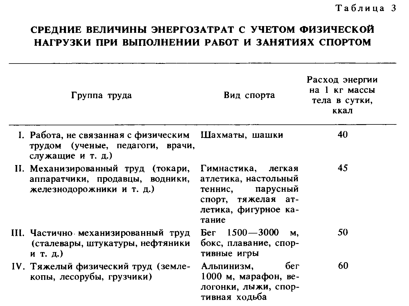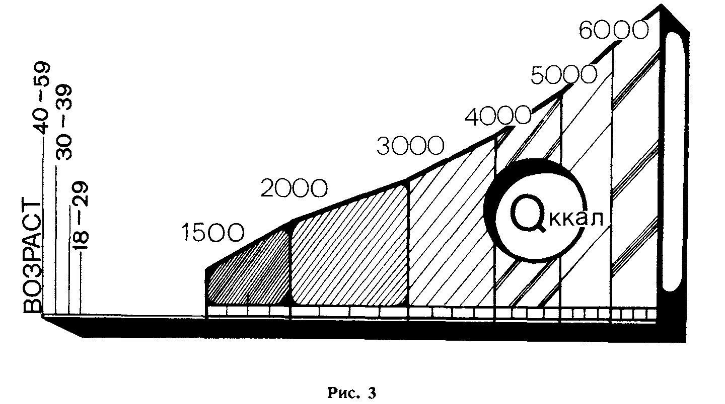 определяем, к какой группе труда относится наша работа (табл. 3). Затем на номограмме (см. рис 2) замеряем с помощью линейки расстояние от найденной группы труда до максимального предела своей массы тела. Полученный отрезок откладываем на следующей номограмме (см. рис. 3) от отметки „возраст“ вправо. Другой конец отрезка укажет величину необходимой вам калорийности питания.Например, человек проводит свой рабочий день за письменным столом, а его максимальный предел массы тела 70 кг. Возраст человека 25 лет. Измеряем расстояние на номограмме (см. рис. 2) от группы труда I до массы тела 70 кг. Полученный отрезок откладываем на следующей номограмме (см. рис. 3) от возраста 18–29 и получаем энергопотребность этого человека — 2750 ккал.