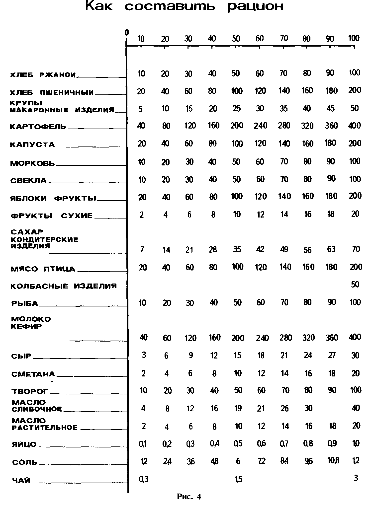 Теперь на верхней линейке номограммы (рис. 4) находим значение 98. И от этой точки проводим вниз линию. Ее пересечение с горизонтальными рядами цифр и даст количество необходимых продуктов на день (в граммах).