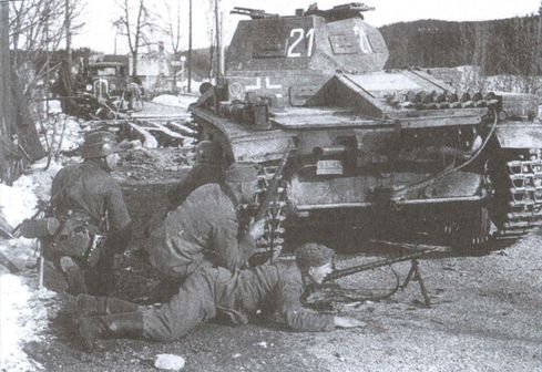 Танки 40-го отдельного танкового батальона вермахта на территории Норвегии. В это подразделение входили немецкие легкие танки Pz.Kpfw.I и Pz.Kpfw.II, командирские машины, а также экспериментальные двухбашенные NbFz. Из-за сложного рельефа местности в Скандинавии использовать большие массы танков для прорыва вражеской обороны было затруднительно. Поэтому боевые машины поддерживали пехоту только в отдельных штурмовых операциях, а также для демонстрационно-пропагандистских целей. Апрель — май 1940 года (АВЛ)