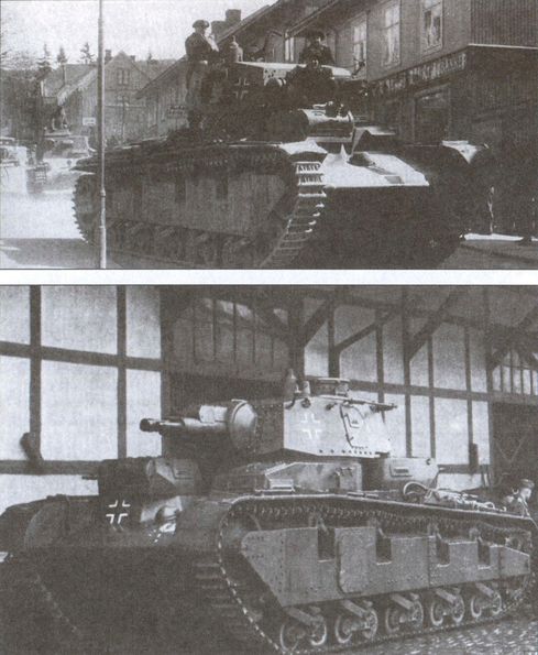 Двухбашенные немецкие танки NbFz. Три таких машины находились в составе 40-го танкового спецбатальона. Одна из машин во время боевых действий застряла в болотистой ложбине под Лиллехаммером и была взорвана экипажем. Боевые машины 40 отб были серыми, на бортах башни и подбашенной коробке передней пулеметной башни были нанесены кресты. На верхнем переднем листе корпуса, перед рубкой механика-водителя была нарисована голова слона. На одном фото на заднем листе главной башни была видна буква «R». В ходе боев в Норвегии на правую заднюю часть башни одного из танков экипаж нанес имя и фамилию погибшего танкиста и дату его гибели. Апрель — май 1940 года (АВЛ)