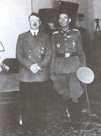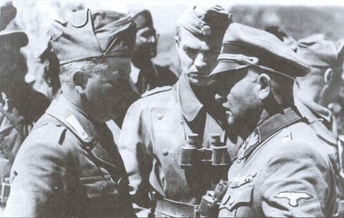 Союзники по разбою. Командир бригады «Лейбштандарт СС Адольф Гитлер» Зепп Дитрих (справа) беседует с итальянским генералом Наварини. Территория Югославии, апрель 1941 года (РГАКФД)