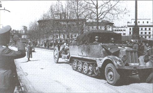 Генерал-полковник фон Клейст принимает парад своих войск в Белграде. Идет техника 119-го моторизованного полка 11-й танковой дивизии. Апрель 1941 года (АВЛ)
