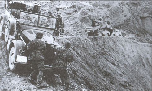 Подразделения бригады войск СС «Лейбштандарт СС Адольф Гитлер» на горных дорогах Греции. На переднем плане виден штабной автомобиль «Хорьх-601». Апрель 1941 года (АВЛ)