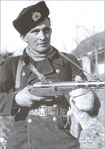 Морской пехотинец младший сержант В. В. Целиков, представленный командованием к званию Героя Советского Союза. Обмундирован во флотскую куртку, зимнюю шапку и свитер. Вооружен 7,62-мм пистолетом-пулеметом конструкции Шпагина с рожковым магазином. Закавказский фронт, январь 1941 года (АВЛ)