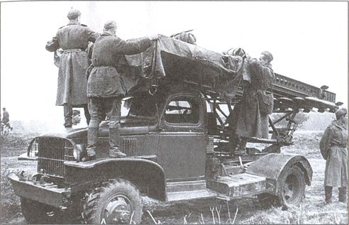 Расчет реактивной установки гвардейских минометов БМ-13 готовится к открытию огня. Система установлена на шасси американского двухосного автомобиля Chevrolet. Северо-Кавказский фронт, февраль 1943 года (АВЛ)