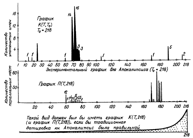 Если ли бы такое, принятое сегодня, расположение Апокалипсиса в Библии было хронологически верным, то его частотный график-столбец имен К(T, 218), то есть при Q = 218, должен был бы иметь вид, показанный на рис. 30. См. нижний график
