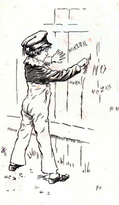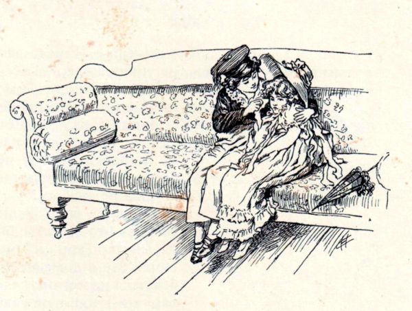 «Ну и дела!» — изумился Кобс и решил разузнать, что привело их сюда одних. Он поднялся по лестнице и, постучавшись, зашёл в номер, где на большом диване, который по сравнению с маленькими влюблёнными казался просто огромным, сидели мистер Гарри и мисс Нора. Девочка плакала, а мальчик вытирал ей слёзы крохотным носовым платком. Увидев Кобса, Гарри бросился к нему со словами: