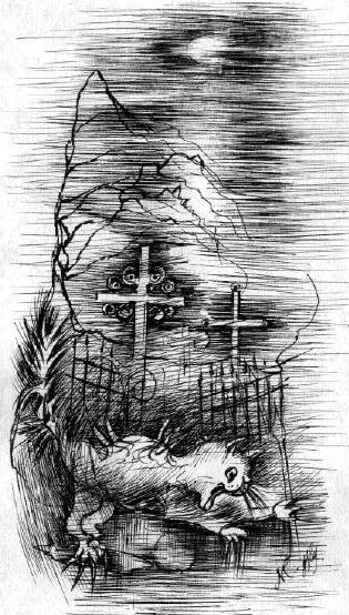 После очередного удара часов наступила тишина: такая отчетливая и прозрачная, что Гриша испугался нарушить ее громким голосом. «Дьявол, приди и купи мою душу! Дьявол, приди и купи мою душу!» — зашептал он. Повторив это несколько раз, он замолчал и прислушался. Было тихо; потом из глубины кладбища донеслось, приближаясь, мяуканье. Вскоре на соседнюю могилу вспрыгнул огромный черный кот. Глядя на Гришу сверкающими зелеными глазами, он разинул пасть в громком вопле: «Мяу!».