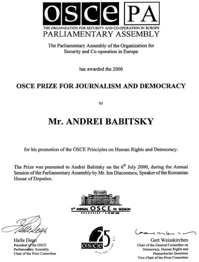 29 апреля 2000 г. Андрей Бабицкий удостоен премии Парламентской ассамблеи Организации по безопасности и сотрудничеству в Европе в области журналистики.