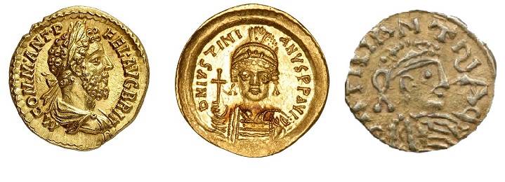 (Слева – ауреус II века н.э. В центре– солид Юстиниана.Справа – тремисс Меровингов. Все монеты – в идеальном состоянии. Почувствуйте разницу.)