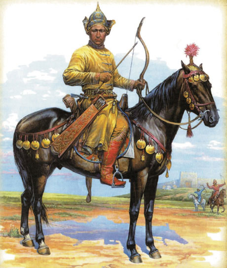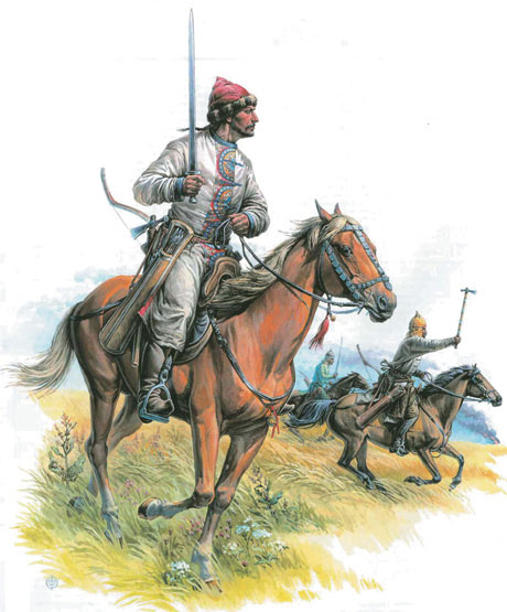под именем Кавказской и доныне еще удивительною в своих развалинах. В VII веке они являются в Истории Византийской с великим блеском и могуществом, дают многочисленное войско в помощь Императору; два раза входят с ним в Персию, нападают на Угров, Болгаров, ослабленных разделом сыновей Кувратовых, и покоряют всю землю от устья Волги до морей Азовского и Черного, Фанагорию, Воспор и большую часть Тавриды, называемой потом несколько веков Козариею. Слабая Греция не смела отражать новых завоевателей: ее Цари искали убежища в их станах, дружбы и родства с Каганами; в знак своего к ним почтения украшались в некоторые торжества одеждою Козарскою и стражу свою составили из сих храбрых Азиатцев. Империя в самом деле могла хвалиться их дружбою; но, оставляя в покое Константинополь, они свирепствовали в Армении, Иверии, Мидии; вели кровопролитные войны с Аравитянами, тогда уже могущественными, и несколько раз побеждали их знаменитых Калифов.Аланы. Вооружение воина Хазарского каганата