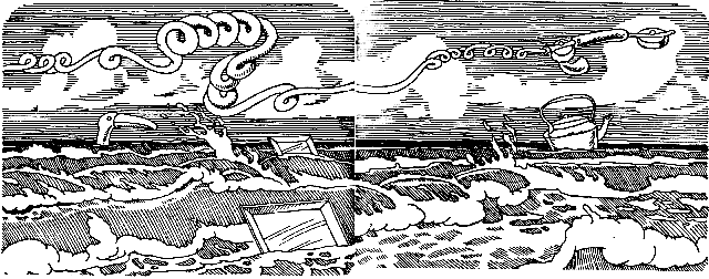 Тем временем грозовые тучи, налетевшие со всех четырех сторон, соединились, образовав вокруг Дракона что-то вроде кратера вулкана или огромной воронки, вращающейся все быстрее и быстрее, и все цвета — и серо-желтый, и свинцово-серый, и кроваво-красный, и черный — перемешались. А Дракона Счастья вместе с Атрейо завертело по кругу, словно они попали в мощный водоворот… И тут они увидели Великанов.