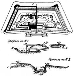Тип форта проф. Величко 1897 г. схематически изображен на фиг. 132. Он имел в плане начертание трапеции. Как и в предшествовавшем образце вал здесь один, приспособленный для пехоты, но на всякий случай в центральной части напольного фаса оставлены барбеты р для пары-другой тяжелых так называемых рекогносцировочных орудий, предназначенных для обстреливания в первый период осады дальних лагерей и парков противника. В плечных углах были устроены барбеты б для легких противоштурмовых орудий, выкатываемых при отбитии штурма на форт из своих убежищ У по пологим земляным аппарелям А. Рядом с убежищами для указанных орудий расположено было под напольным валом убежище УД для дежурной части, связанное потерной п с горжевой казармой К, над которой устроена пехотная позиция для развития огня в тыл. Внутренняя позиция или ретраншемент, имевшийся в образце 1889 г., в данном проекте исчез: это произошло вследствие желания уступить требованиям экономии, ибо увеличение внутреннего пространства форта влекло за собой удлинение рвов с их дорогостоящими бетонными эскарпом и контрэскарпом.