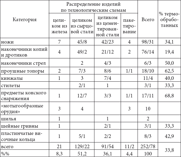 Подводя итоги технологической характеристике кузнечных поковок VIII–VI вв. до н. э. из Волго-Камья, можно констатировать, что древнейшие изделия из черного металла на рассматриваемой территории являются продукцией развитого кузнечного ремесла. Об этом свидетельствует разнообразие форм и типов как изделий, так и самих кузнечных приемов. Мы уже обращали внимание на преобладание стальных изделий в исследованной коллекции (220 из 252 исследованных предметов). При этом 41,3 % от всех стальных составляют изделия, изготовленные из специально полученной стали, т. е. с использованием разнообразных приемов цементации: сквозной, поверхностной односторонней, поверхностной двусторонней. Велика доля предметов, подвергавшихся термической обработке (табл. 5).