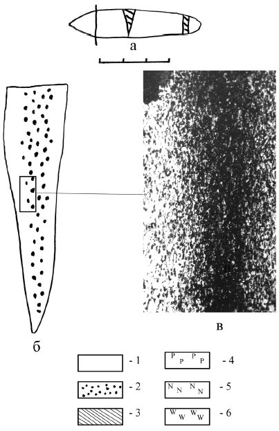 феррита в металле ахмыловских ножей (для сравнения скажем, что обычная микротвердость феррита в древних изделиях колеблется от 160 до 193 кг/мм2). При этом на фоне зерен феррита фиксируются включения нитридов железа.Рис. 4. Старший Ахмыловский могильник, погр. 734. Ан. 1090: а – нож, VI в. до н. э.; 6 – технологическая схема изготовления (целиком из стали); в – фотография микроструктуры, х70 (феррито-перлит)