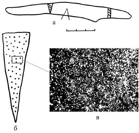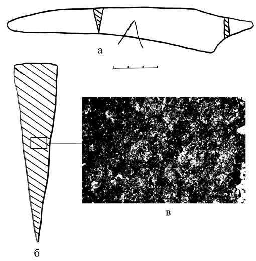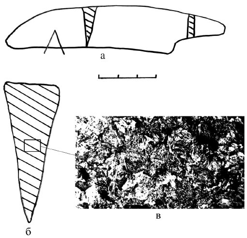 Рис. 3. Старший Ахмыловский могильник, погр. 892. Ан. 1142: а – нож, VI в. до н. э.; 6 – технологическая схема изготовления (целиком из неравномерно науглероженной сырцовой стали); в – фотография микроструктуры х70 (феррит, феррито-перлит)