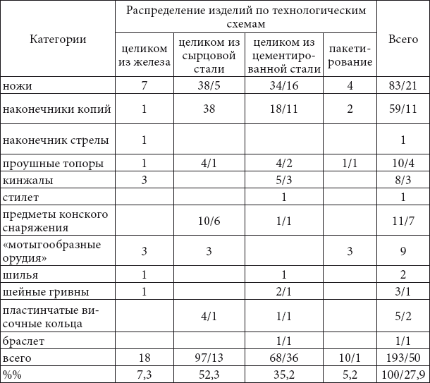 При сопоставлении технологий металлографически исследованных ножей, встречаемых в комплексах с различными группами кельтов (KAH-I, КАН-П, КАМ), различия не выявлены. Так, в группе изделий, связанных с кельтами ананьинского типа с линзовидным сечением втулки (KAH-I), зафиксированы ножи, откованные из сырцовой стали (погр. 72; погр. 270; погр. 334), из высокоуглеродистой стали (погр. 93), в том числе с последующей термообработкой (погр. 167).