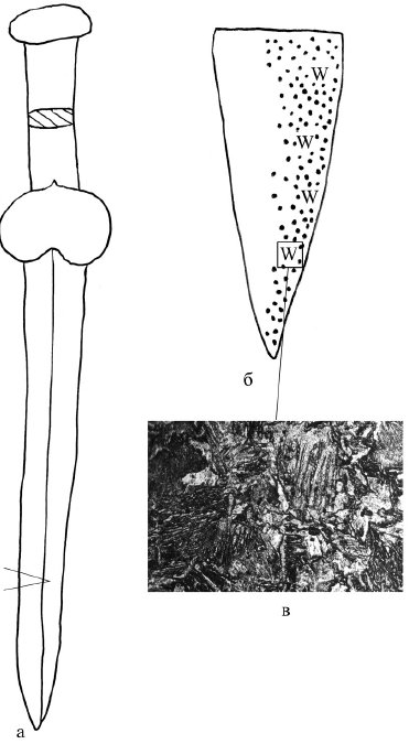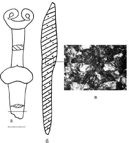Рис. 20. Старший Ахмыловский могильник, погр. 2266. Ан. 1085: а – кинжал, VII–VI вв. до н. э.; 6 – технологическая схема изготовления (целиком из стали с последующей мягкой закалкой); в – фотография микроструктуры, х70 (сорбит)