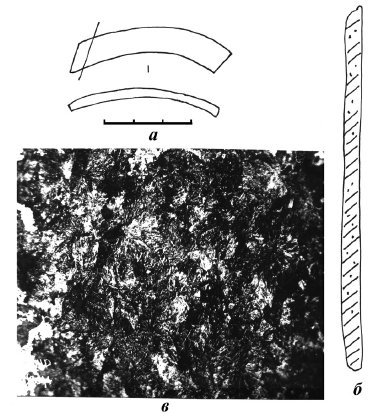 Рис. 21. Старший Ахмыловский могильник, P/I, Б/15. Ан. 1120: а – браслет; б – технологическая схема изготовления (целиком из качественной стали с последующей закалкой); фотография микроструктуры, х200 (сорбит)