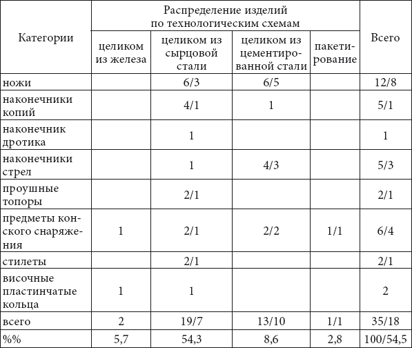 Обращает на себя внимание большое количество термообработанных изделий (18 экз.), причем применялась термообработка только одного вида – мягкая закалка. Она встречена на всех категориях изделий.