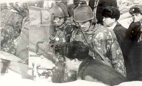 Самарканд, февраль 1980 г. На НП полка: м-р Иван Бут, ст. л-т Виктор Трутнев и представители Самаркандского Обкома КПСС (из личного архива В. Трутнева)