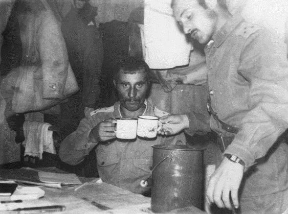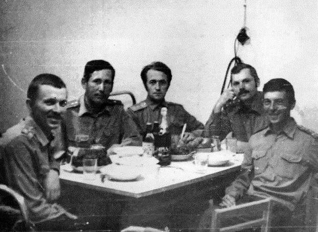 «Бурлит в бидоне наша бражка, Пусть постоит еще денек. Хлебнем пока воды из фляжки, Попьем с колючкою чаек. Какой душок, какая пенка, Рефлексы давят на слюну! Наш главный дегустатор Генка МахнулВстреча Нового 1981 года. Комната в модуле. Слева направо: помощник начальника автомобильной службы Виктор Спирин, начальник автомобильной службы Иван Иванович Василец, начальник автосклада Николай Широкорадюк, начвещ полка Воронин и начпрод полка Кузнецов (из личного архива Виктора Спирина)