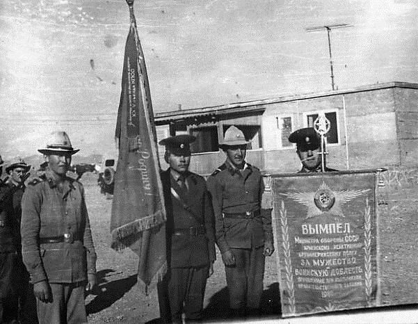 артиллерийскому полку ЗА МУЖЕСТВО И ВОИНСКУЮ ДОБЛЕСТЬ, проявленные при выполнении правительственного задания 1980 г.»Вымпел Министра обороны СССР «ЗА МУЖЕСТВО И ВОИНСКУЮ ДОБЛЕСТЬ» С вымпелом прапорщик Владимир Бульчак, с переходящим знаменем ТуркВО прапорщик Владимир Борисенко, рядом мл. сержанты и ефрейтор БУ полка (из личного архива Владимир Борисенко)