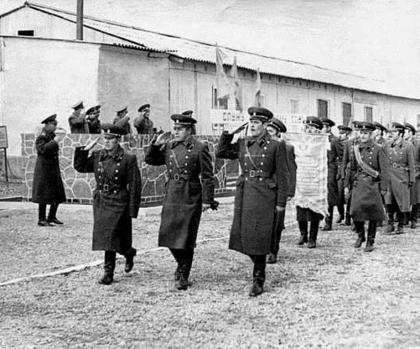 Вручение Вымпела, на трибуне 1-й ряд, слева направо: начальник политуправления ТуркВО генерал-лейтенант Родин В.С., командующий ТуркВО генерал-полковник Максимов Ю.П., командир полка подполковник Кулешов Е.Г., начальнике политотдела 5-й мсд полковник Павличенко В.К.; 2-й ряд слева направо: заместитель командующего войсками ТуркВО по тылу генерал-лейтенант Шудра Н. А., заместитель командира по политической части 3-го дивизиона капитан Корецкий М.Г.