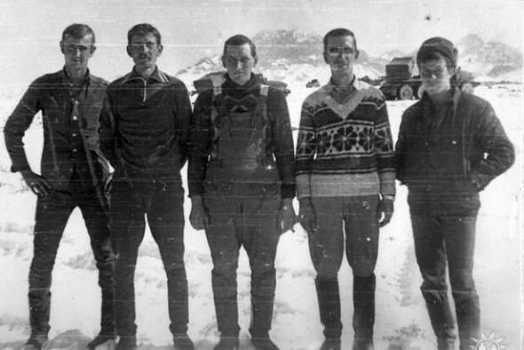 Фото с места событий. Внизу стоят: слева Гриша Павленко, справа Вовка Поплыко. Вверху на капоте слева направо: Коля Слепкин, Лешка Мельниченко, Юра Халеев, Саня Ремизов, Вовка Мезин (из личного архива Валерия Максименко)