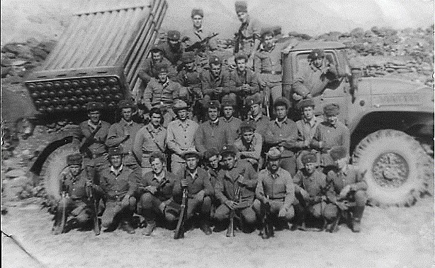 б только пота на все мои года». Как в песне Булата Окуджава. Только мы не шарманщики, а артиллеристы-реактивщики и в нашей шарманке сорок труб. Авторота подвезла снаряды, достаем из ящиков и укладываем на стеллажи в ТЗМки. (Из личного архива Валерия Сидельникова)5-ая батарея, Джелалабад! На очередной «операции», в центре в «ватнике» я, слева от меня КВУ Вениамин Подзоров, еще левее ЗКБПЧ Сергей Здор. Нижний ряд: третий справа фельдшер прапорщик Борис Сынжеряну. Над ЗКБПЧ Сергеем Здор в третьем ряду крайний слева Сергей Мазюта, второй отличный вычислитель «Белка», а ниже в первом ряду третий слева Николай Гущин. В первом ряду слева направо второй водитель Мусабаев, четвертый - командир «отделения водителей» Темиргалиев, рядом со мной справа от меня командир БМ Дичко. Солдаты и сержанты - в большинстве «дембеля», в основном из Белоруссии, в лицо всех помню, не просто хорошие, а просто отличные были ребята! А «операция» - ходили в горы за останками самолета… Летел в Джелалабад известный журналист и самолет при посадке был сбит, погиб Александр Каверзнев. Джелалабадский аэродром имел специфику: вокруг горы, рядом «взлетка» короткая, поэтому в основном летали в Кабул вертушки парами, редко АН-24. Но когда заходил на посадку или взлетал АН-24, он проходил почти рядом над горами (из личного архива Сергея Мандрыка)