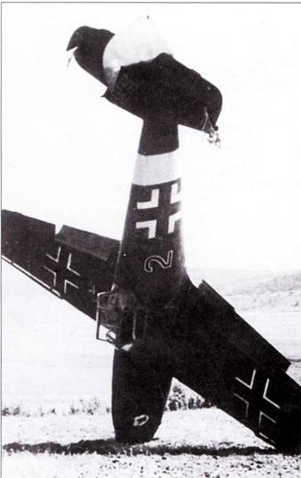 Истребитель «Черная 2» из IIIAJG 77 скапотировал при посадке. Тактический помер обведен белым.