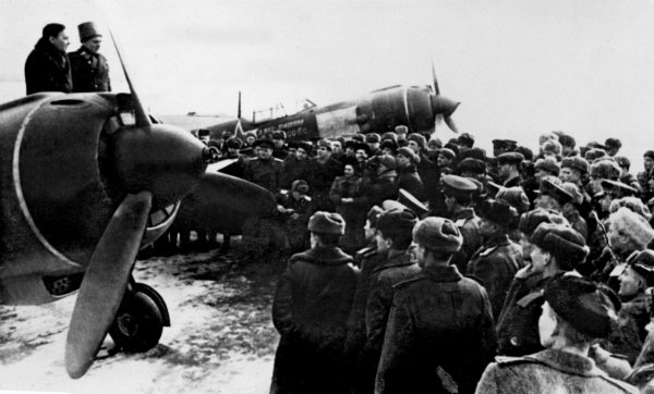 Митинг на Центральном аэродроме г. Москвы по случаю подарка летчикам 5-го ГвИАП двух самолетов Ла-5Ф джаз-оркестром Леонида Утесова