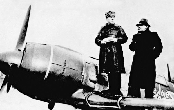 На крыле одного из двух самолетов Ла-5Ф «Веселые ребята», переданных джаз-оркестром Леонида Утесова летчикам 5-го ГвИАП, стоят комиссар полка В. Рулин и Л. Утесов